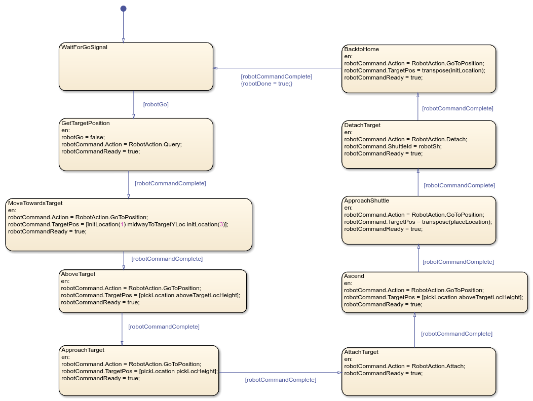 At each state in the loop, the robot sends a command to the network layer. When the plant model completes the command, the robot moves to the next state. After the robot completes the full sequence of commands, the subchart informs the rest of the model by setting the robotDone