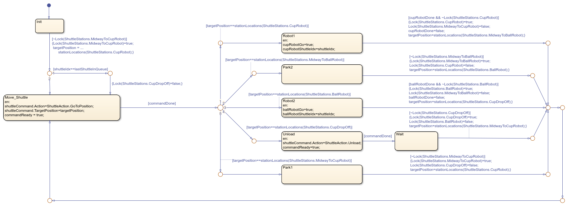 This example shows how you can use Stateflow® charts to model a flexible manufacturing system that uses two independently operating pick and place robot arms to place balls into cups. The model uses distributed control logic to send commands to and monitor the status of off-the-shelf components.
