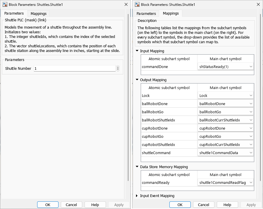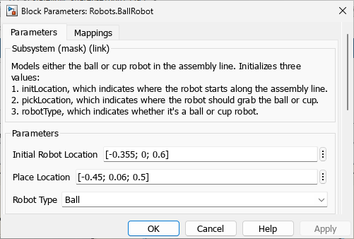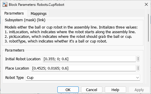 The parameters define different locations, dropoff points, and types for each robot. Similarly, each robot has different mappings. In the Block Parameters window, select the Mappings tab.