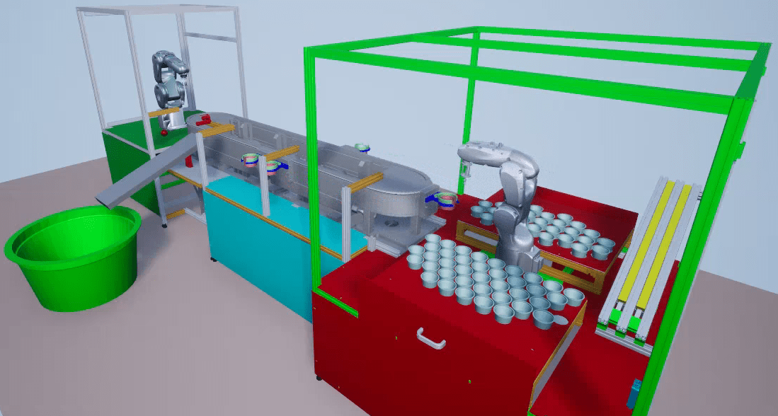 When the manufacturing system initializes, the shuttles queue between the slide and the cup robot. The first robot enters the cup robot station, receives a cup, and leaves. Afterwards, the next shuttle takes its place. This continues until all shuttles leave the starting queue.