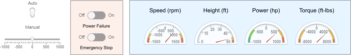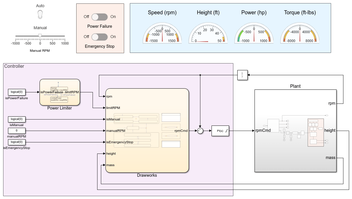 You can observe the operation of the drawworks by using the interface at the top level of the model. The switches change the values of the isPowerFailure, isManual, and isEmergencyStop signals in the top-level model.