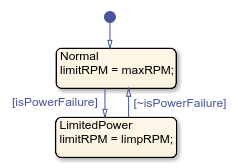 In the Raise and Lower states, the MATLAB Function RpmLimiter prevents the RPM of the drawworks from exceeding the maximum allowed RPM. The Power Limiter chart outputs this data to the Drawworks Controller chart.