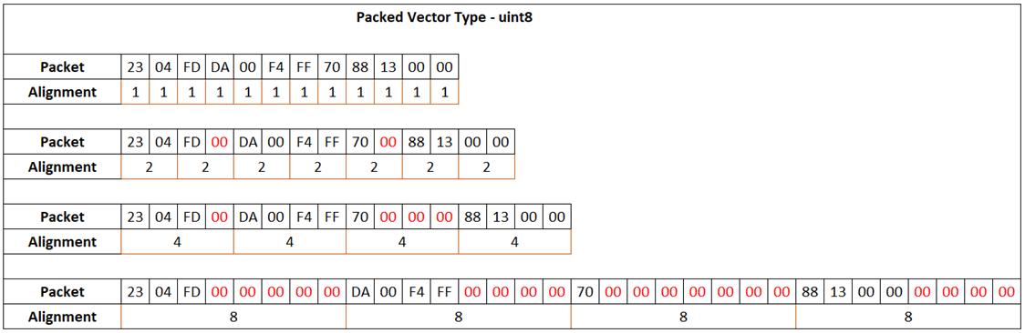 For a packet size of 16 and larger, the byte alignment is calculated with respect to