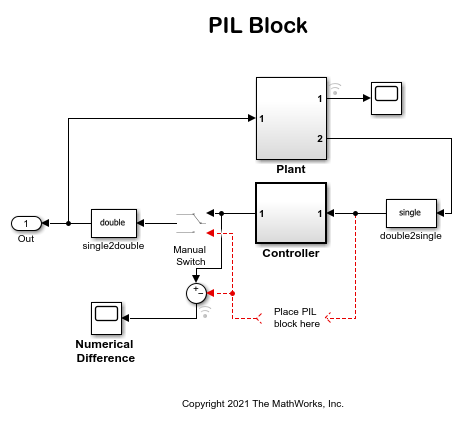 6. You can switch between the original subsystem and the PIL block subsystems by double-clicking the Manual Switch block. Double-click the Numerical Differences block to see the difference between the simulated Controller subsystem and the PIL block running on the STM32 Processor based board.