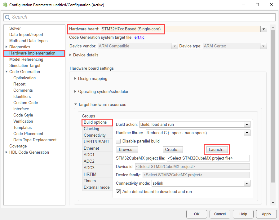 1. Click Launch to open the selected STM32CubeMX project in STM32CubeMX tool.