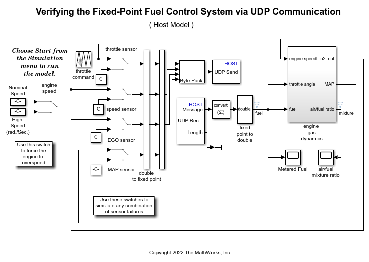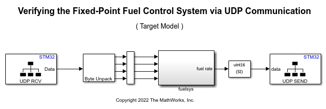 In this task, you will run the Model Fault-Tolerant Fuel Control System example on the STM32H73ZI2 board. The control algorithm runs on the target while the host runs a plant simulation of the system. The target and the host communicate via UDP. The target model receives the fuel system control sensors values from the host model and transmits back the calculated fuel mixture ratio to the host computer.