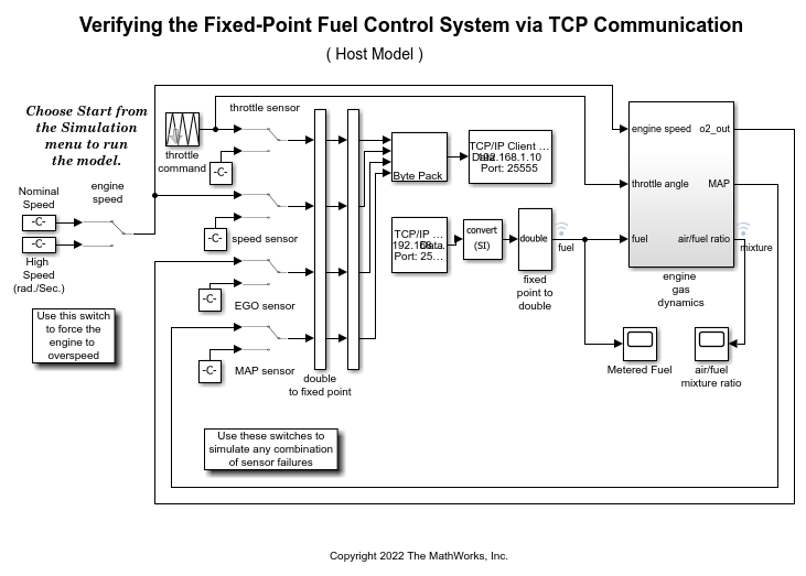 In this task, you will run the Model Fault-Tolerant Fuel Control System. The control algorithm runs on the target while the host runs a plant simulation of the system. The target and the host communicate via TCP. The target model receives the fuel system control sensors values from the host model and transmits back the calculated fuel mixture ratio to the host computer.