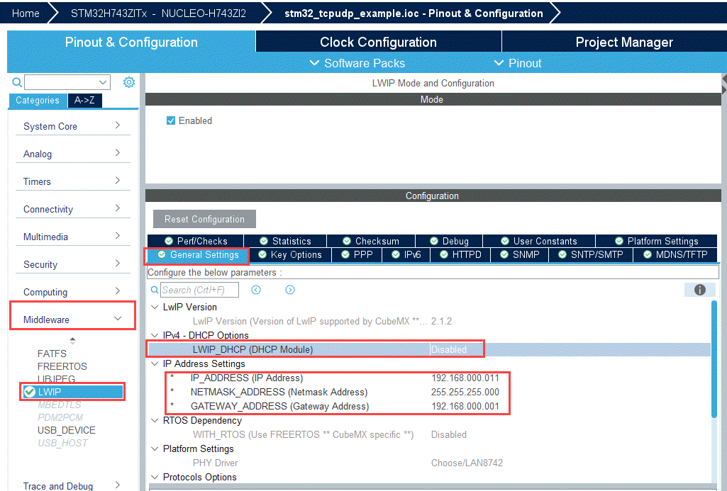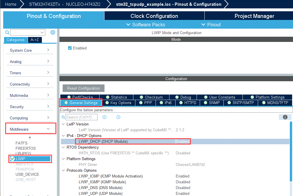 • In the STM32CubeMX tool, navigate to Middleware > LWIP > General Settings and IPv4-DHCP Options