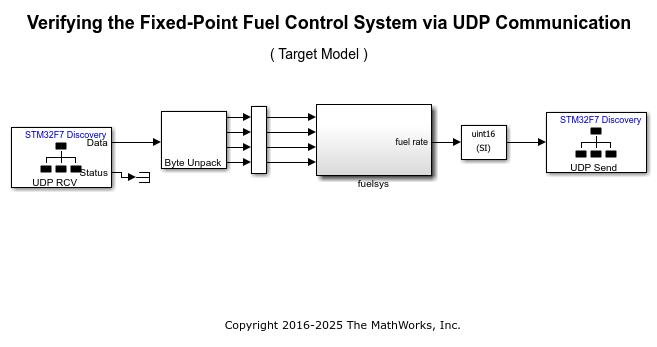 In this task, you will run the Model Fault-Tolerant Fuel Control System example on the STM32F746G Discovery Board. The control algorithm runs on the target while the host runs a plant simulation of the system. The target and the host communicate via UDP. The target model receives the fuel system control sensors values from the host model and transmits back the calculated fuel mixture ratio to the host computer.