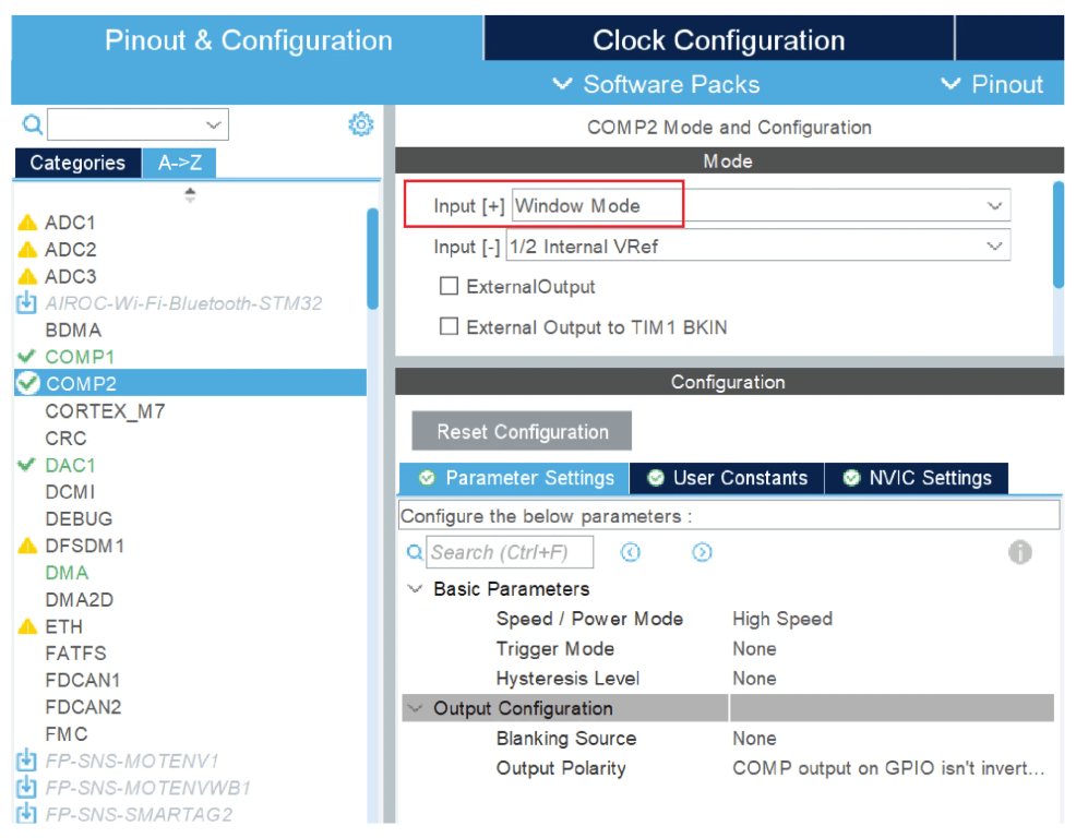 Use STM32CubeMx to specify the mode and required IOC configuration for each comparator.