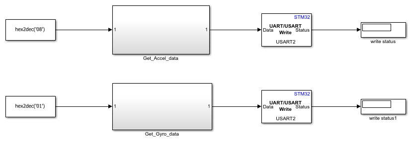 • In the second model, AccelGyroSCI, the SCI Write block sends serial data to USBTX, the default serial transmit port on the Nucleo board. Unlike the first model, this model is deployed on the Nucleo board.