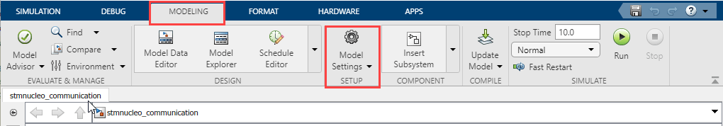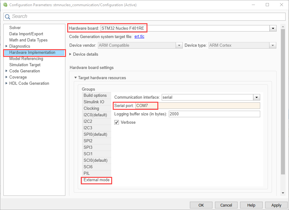 These models are pre-configured for STMicroelectronics Nucleo F401RE board. To configure these models for other supported Nucleo boards, browse to Simulation > Model Configuration Parameters > Hardware Implementation on the Simulink model toolbar. From the Hardware board list, select any other Nucleo board, and click OK.