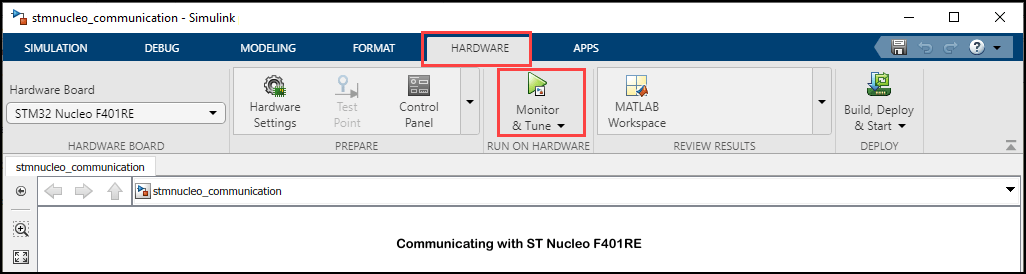 7. On the Simulink model toolbar, click the Deploy To Hardware button. This action builds, downloads, and runs the model on the Nucleo board.