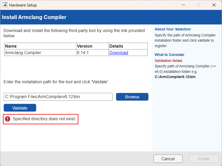 6. Click Finish, if the validation of Armclang compiler is successful.