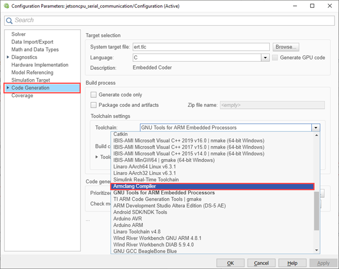 1. In the Configuration Parameters window, click Code Generation pane. By default, the Toolchain is GNU Tools for ARM Embedded Processors.