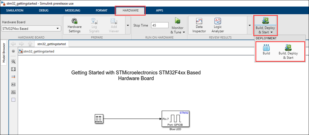 Once you have installed STM32™ Microcontroller Blockset, perform the hardware board setup process to register the STMicroelectronics software tools required to generate code and deploy code to the connected STMicroelectronics® STM32 hardware boards. For more information, see Install Support for STMicroelectronics STM32 Processors.