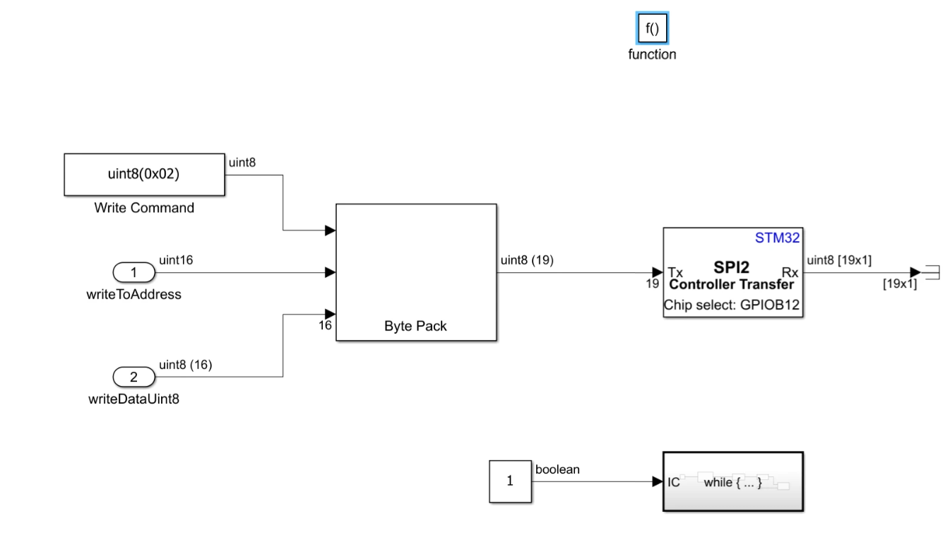 This example shows how to use Serial Peripheral Interface (SPI) blocks provided in the STM32 Microcontroller Blockset to interface between an SPI bus and a Microchip 25XX080 8K SPI Bus Serial EEPROM. This EEPROM is organized as a 1024×8-bit (1024 bytes) memory device with a 16-byte page size.The example explains EEPROM module concepts and covers how to: