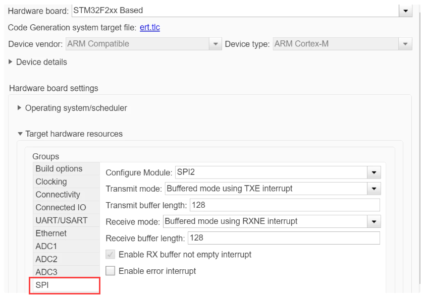 Note: The Data Size, Clock Polarity (CPOL), and Clock Phase (CPHA) parameters configured in the SPI block parameters override the corresponding settings in the STM32CubeMX .ioc file. Ensure that these block-level settings match the target SPI device requirements, as they determine the actual SPI behavior during code execution.