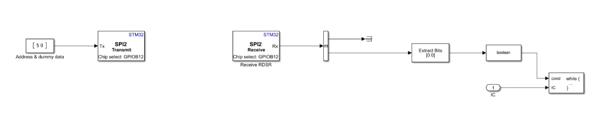 This example shows how to use the SPI Transmit and SPI Receive blocks to read and write data to an SPI EEPROM (25AA080) on STM32 processor-based boards when transmit and receive operations occur at different rates or require independent control. The blocks allow separate management of chip select timing and data length, with buffered interrupt mode handling transfers larger than the SPI FIFO depth.