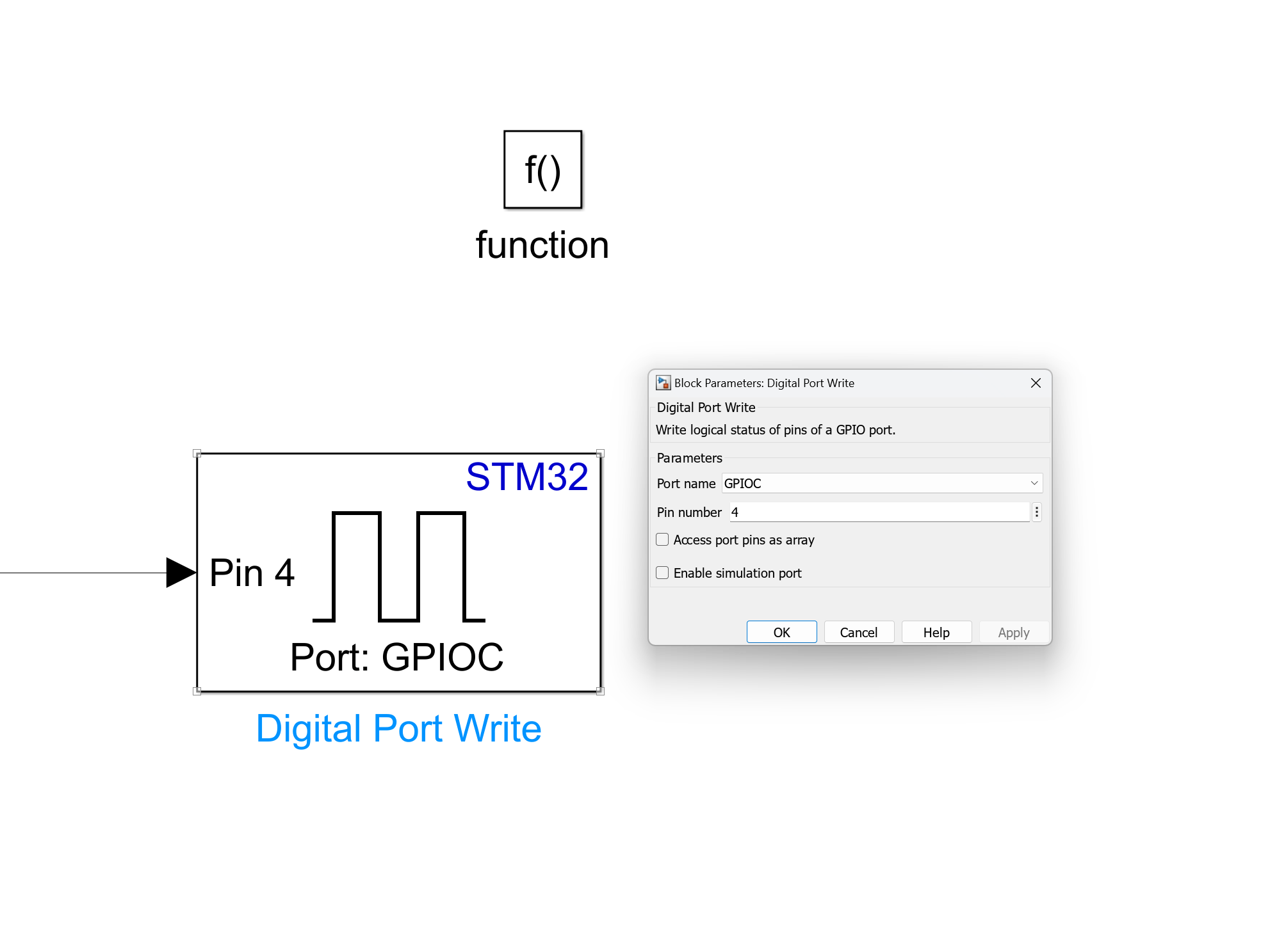 • Adjust GPIO Configurations: Customize Digital Port Write blocks within Digital Pin On and Digital Pin Off subsystems to align with the GPIO pin settings configured in the STM32CubeMX .ioc file.