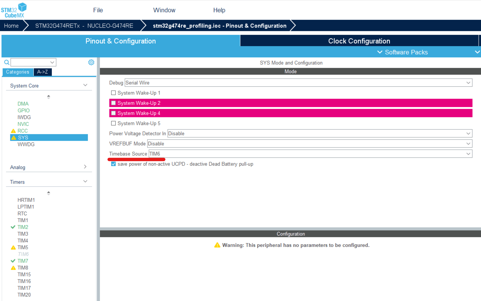 • If a 32-bit timer is designated as the timebase source in the 'SYS' tab, consider using a Basic Timer (such as Timers 6 or 7) instead. This frees up a 32-bit timer for profiling or other application-related tasks. The timebase source is primarily used for delays and timeouts, which do not necessitate advanced capabilities.