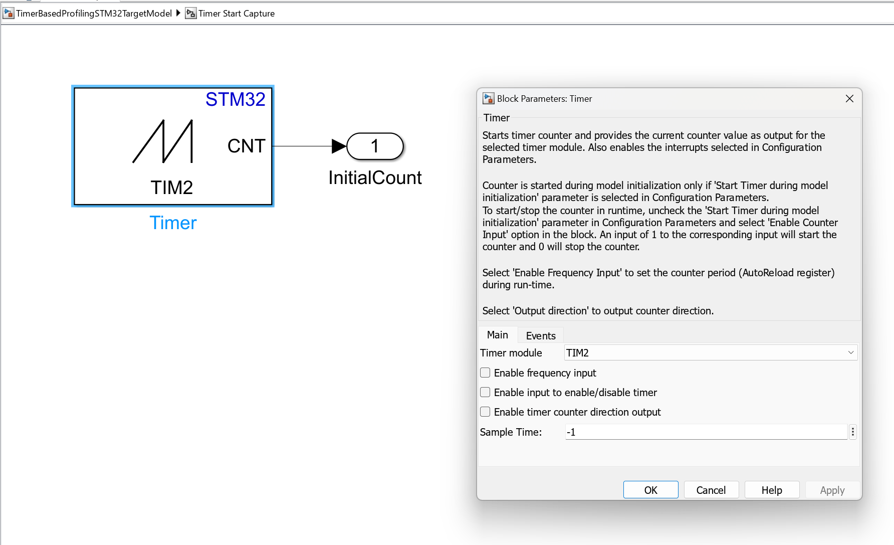 Double-click the blocks to open their block parameter configurations. Ensure that the timer module used in the Initialize Function, Timer Start Capture, and Timer End Capture subsystems matches the one configured for profiling in STM32CubeMX.