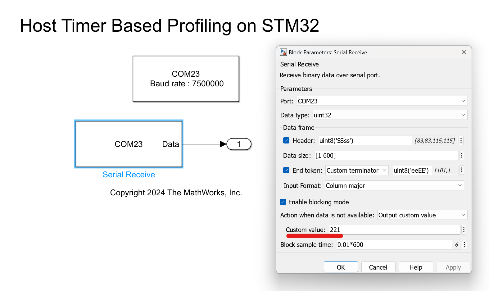 • Customize the Custom value output by the block as needed to handle issues with serial communication.