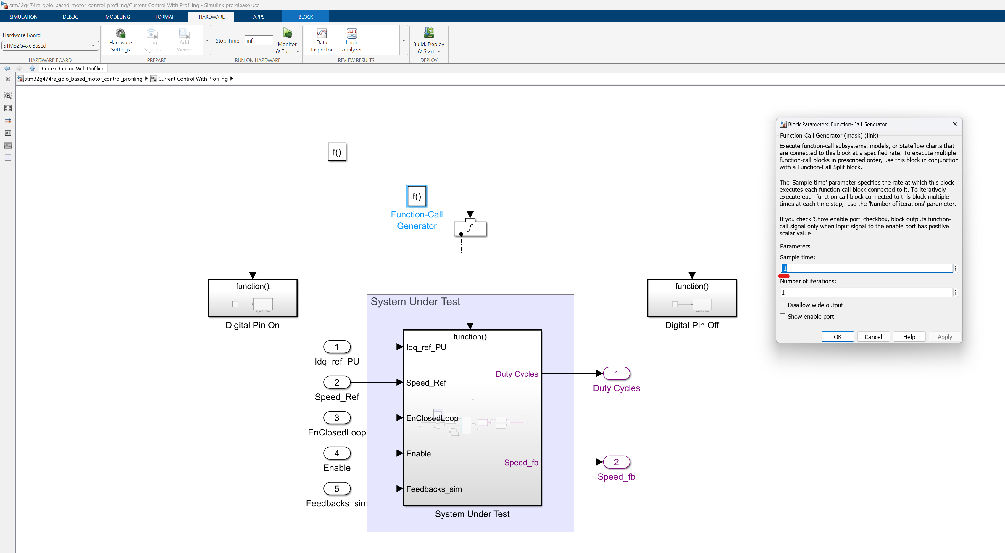 In the previous task, we profiled synchronous code with the sample time set within Simulink. For motor control, however, the control algorithm's interrupts are asynchronous. To profile an asynchronous function call subsystem, follow these steps: