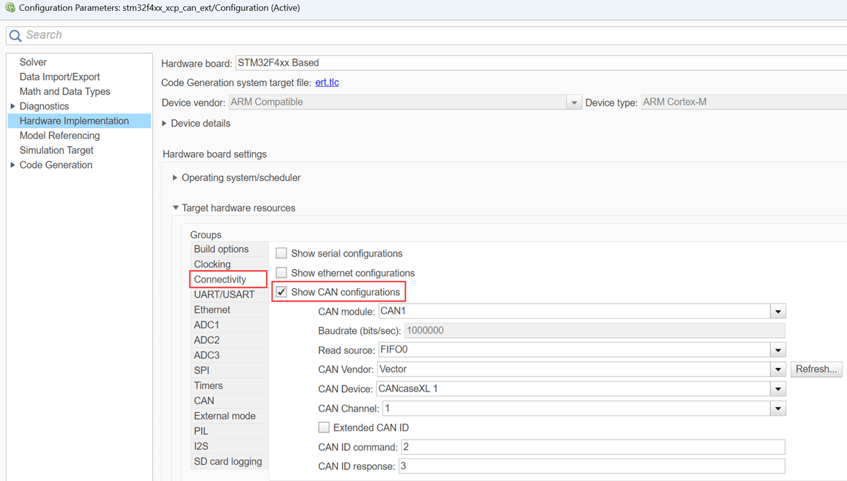 Open the stm32_xcp_can_ext.slx pre-configured model.