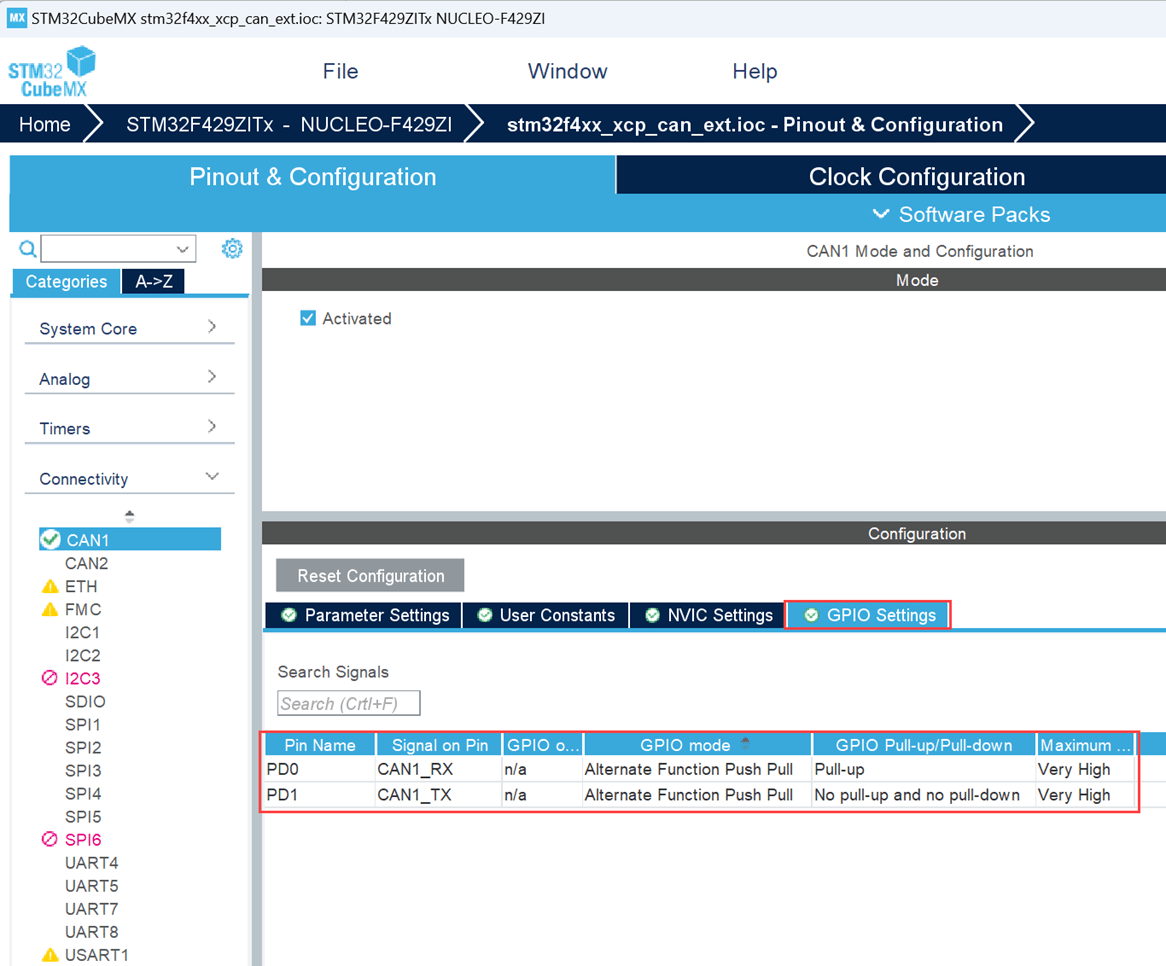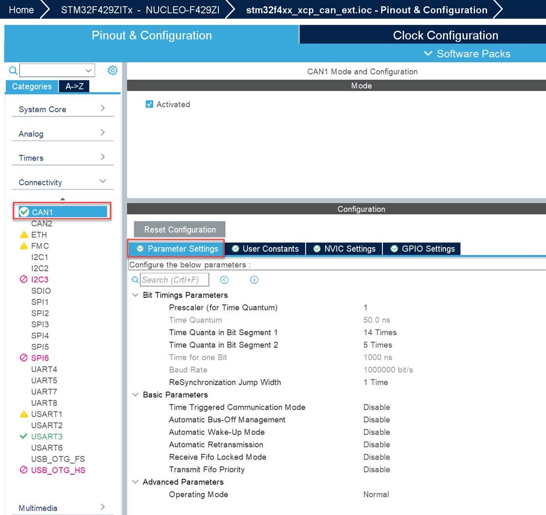 4 In the IOC file, Go to Pinout & Configuration > Connectivity > CAN and configure the parameters as shown.