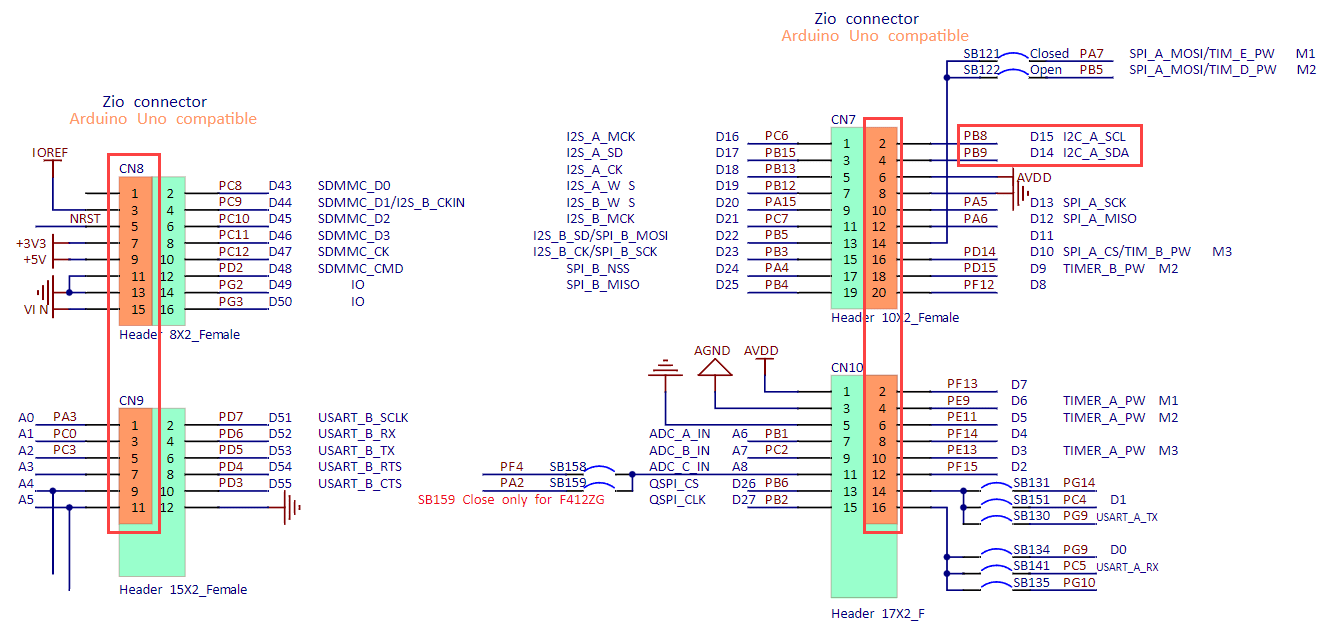 • I2C data line (SDA) gets connected to PB9 (D14)