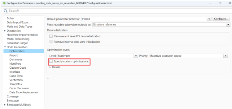 Turn off customize optimizations | Enable the option to choose individual optimization parameters. This parameter disables the parameters in the Details section, preventing you from individually selecting or clearing them. | Specify custom optimizations (Embedded Coder) |