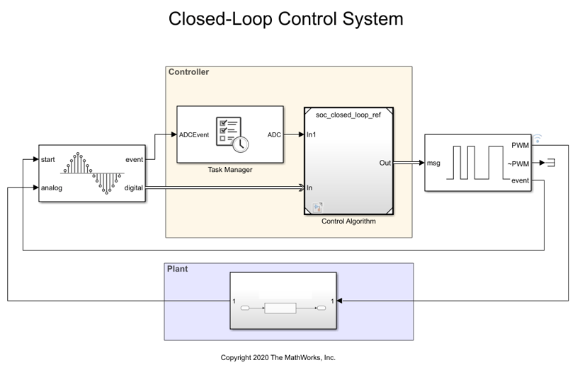 Open the soc_closed_loop.slx closed-loop template model. This model shows a basic closed-loop control application with a low pass filter as a plant. The output of the plant is sampled by the ADC Interface generating an event on each conversion. The Task Manager executes an event-driven task called ADC upon reception of each ADC end-of-conversion event. The ADC Interrupt task contains the feedback control algorithm that executes asynchronously in response to each ADC conversion event. The control algorithm receives feedback through ADC Read and generates duty cycle values for PWM Write block. The PWM Interface block simulates PWM behavior including triggering an event to start the next ADC conversion.