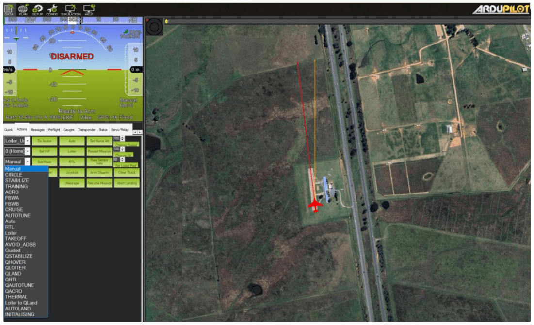 To arm the plane, from the Data tab, go to Actions tab, and then click Arm/Disarm. The display changes from Disarmed to Armed.