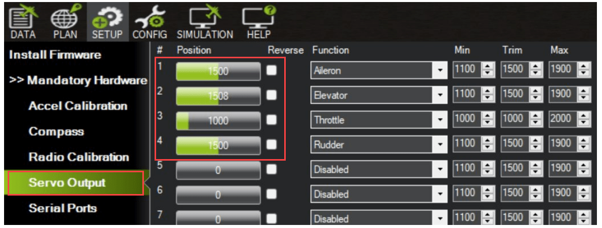 Verify Servo configuration. Go to Setup > Mandatory Hardware > Servo Output and check that the servos are configured correctly.Default mapping for a plane: