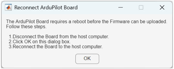 After the build completes, you will be prompted to reconnect your hardware in order to flash the generated executable. A pop-up window will be displayed with instructions.