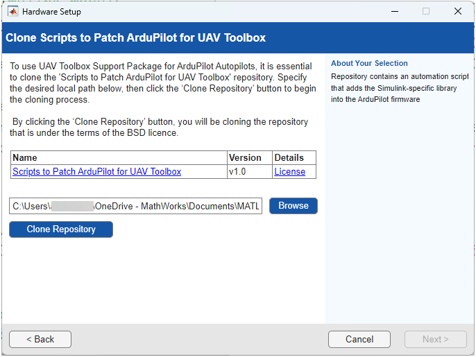 If the cloning process fails and you are unable to resolve the issue, you can manually clone the repository. For more information, see How to Manually Clone the Scripts to Patch ArduPilot for UAV Toolbox Repository.