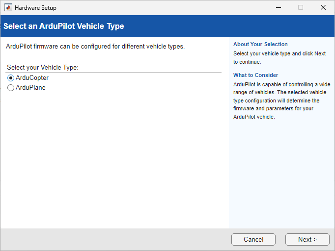 This section helps you complete the Select an ArduPilot Vehicle Type step of the Hardware Setup process (using the Hardware Setup screens).