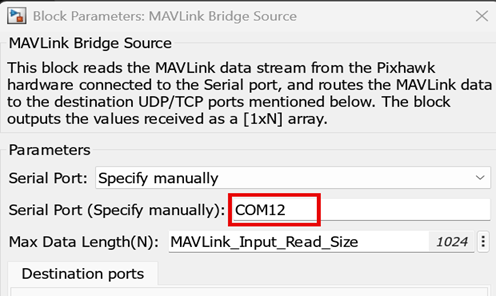 2. Set the correct COM ports in the MAVLink bridge source and MAVLink bridge sink blocks. You can check the device manager on the host computer to find the COM port being used by the Pixhawk hardware.
