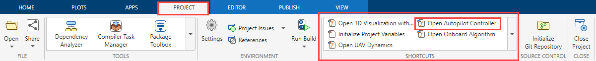 In the Project tab, in the Shortcuts section, click Open Autopilot Controller to open the PX4 controller model,