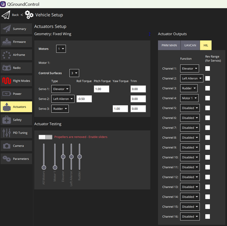 In the QGC, navigate to Vehicle Setup > Actuators and choose the servos and motors for the channels as shown in this image.