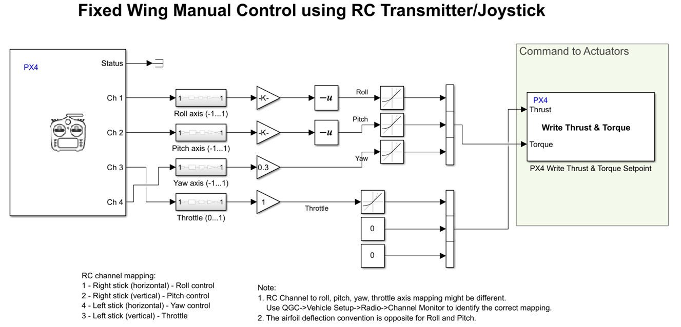 This example shows how to use the UAV Toolbox Support Package for PX4® Autopilots and take manual control inputs from RC Transmitter and control the fixed-wing flight.