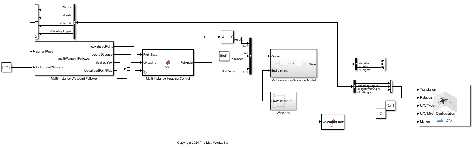 Note: For this example, the Multi-Instance Waypoint Follower and Multi-Instance Guidance Model blocks support simulation using only interpreted execution.