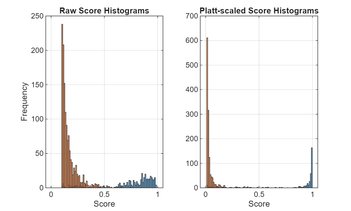 histBins = [0:0.01:1]; figure subplot(1,2,1) histogram(positiveScores,histBins) hold on; histogram(negativeScores, histBins) title("Raw Score Histograms") xlabel("Score") ylabel("Frequency") grid on subplot(1,2,2) histogram(scoresCalib(1:numPositives),histBins) hold on; histogram(scoresCalib(numPositives+1:end), histBins) title("Platt-scaled Score Histograms") xlabel("Score") grid on