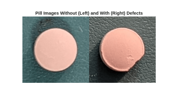 badImage = find(dsTest.Labels=="chip",1); badImage = read(subset(dsTest,badImage)); normalImage = find(dsTest.Labels=="normal",1); normalImage = read(subset(dsTest,normalImage)); montage({normalImage,badImage}) title("Pill Images Without (Left) and With (Right) Defects")