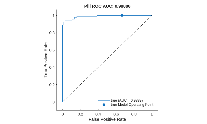 Plot the ROC curve by using the plot (Deep Learning Toolbox) object function of rocmetrics. The ROC curve illustrates the performance of the classifier for a range of possible threshold values. Each point on the ROC curve represents the false positive rate (x-coordinate) and true positive rate (y-coordinate) when you classify the calibration set images using a different threshold value. The solid blue line represents the ROC curve. The area under the ROC curve (AUC) metric indicates classifier performance, with a perfect classifier corresponding to the maximum ROC AUC 1.0.