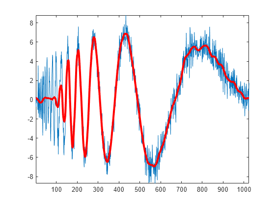 xapp = dddtreecfs('r',wt,'scale',{5}); plot(noisdopp) hold on plot(cell2mat(xapp),'r','linewidth',3) axis tight