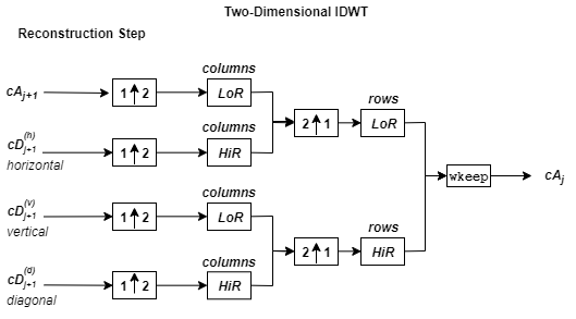 The 2-D wavelet reconstruction algorithm for images is similar to the one-dimensional case. The two-dimensional wavelet and scaling functions are obtained by taking the tensor products of the one-dimensional wavelet and scaling functions. This kind of two-dimensional inverse DWT leads to a reconstruction of approximation coefficients at level j from four components: the approximation at level j+1, and the details in three orientations (horizontal, vertical, and diagonal). The following chart describes the basic reconstruction steps for images.