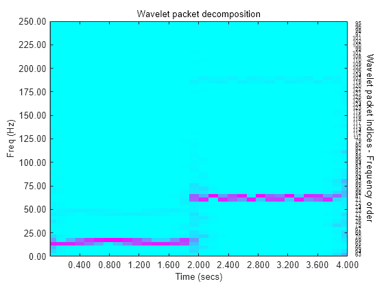 [spec,times,freq] = wpspectrum(wpt,fs) returns a matrix of wavelet packet spectrum estimates, spec, for the binary wavelet packet tree object, wpt. fs is the sampling frequency in hertz. times is a vector of times and freq is a vector of frequencies.