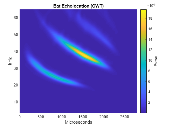 load batsignal t = 0:DT:(numel(batsignal)*DT)-DT; [cfs,f] = cwt(batsignal,'bump',1/DT,'VoicesPerOctave',32); helperCWTTimeFreqPlot(cfs,t.*1e6,f./1e3,'surf','Bat Echolocation (CWT)',... 'Microseconds','kHz')